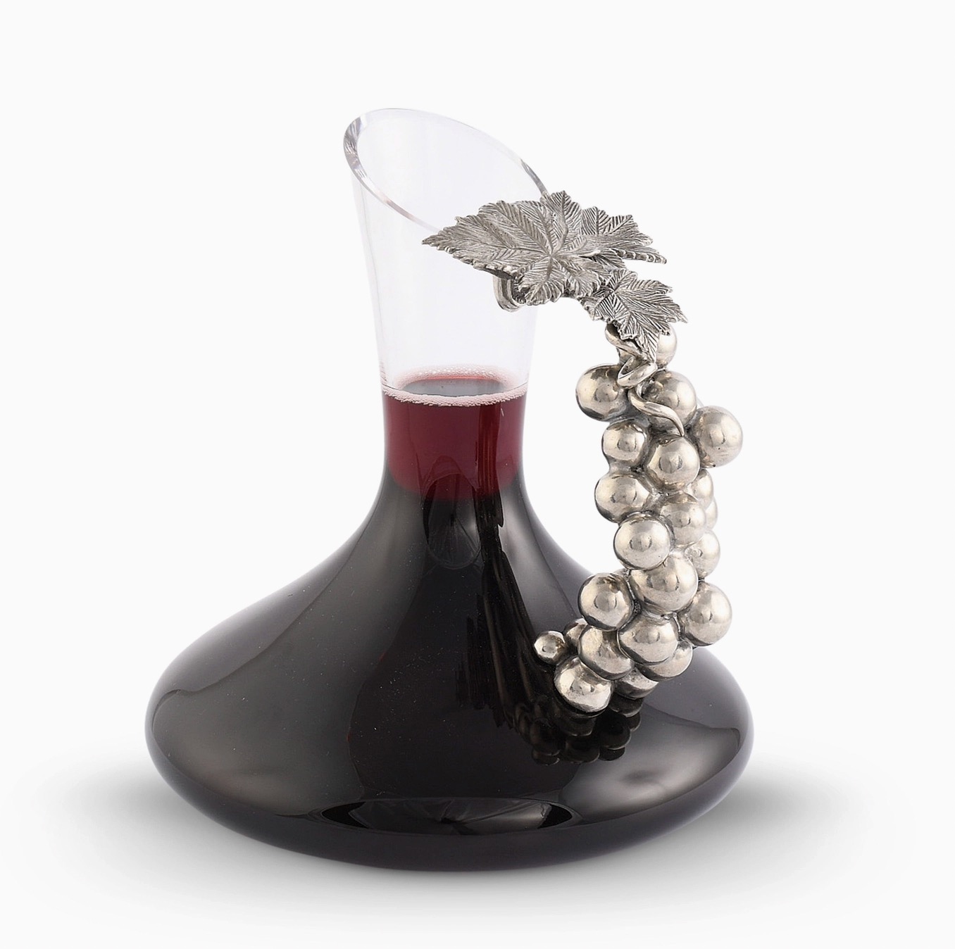 This stylish, elegant wine decanter is a stunning complement to your bar or table. Adorned with a pewter grape cluster handle, uniquely hand carved by artisans using time-honored techniques.