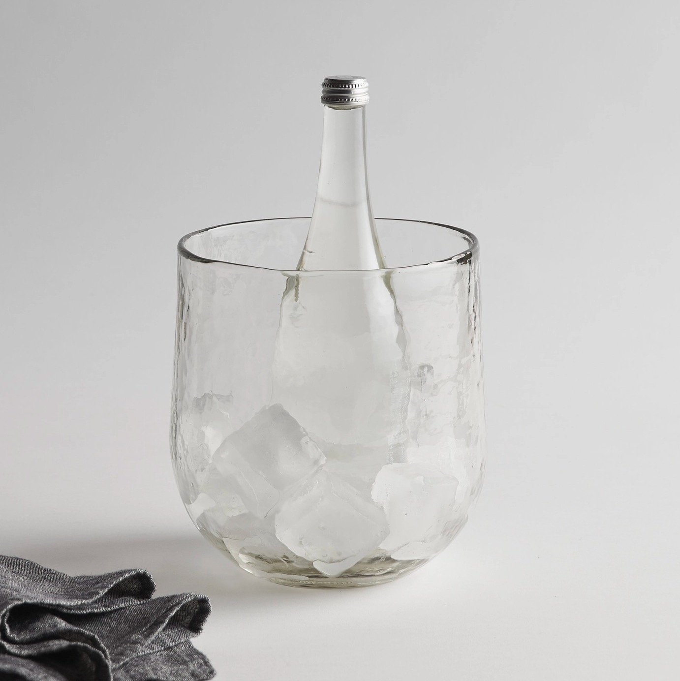 Crafted from recycled glass, this ice bucket catches and reflects light, thanks to its textured pebbled surface. The vessel enhances the sparkle of ice cubes and the elegance of finely bottled white wines and Champagne.