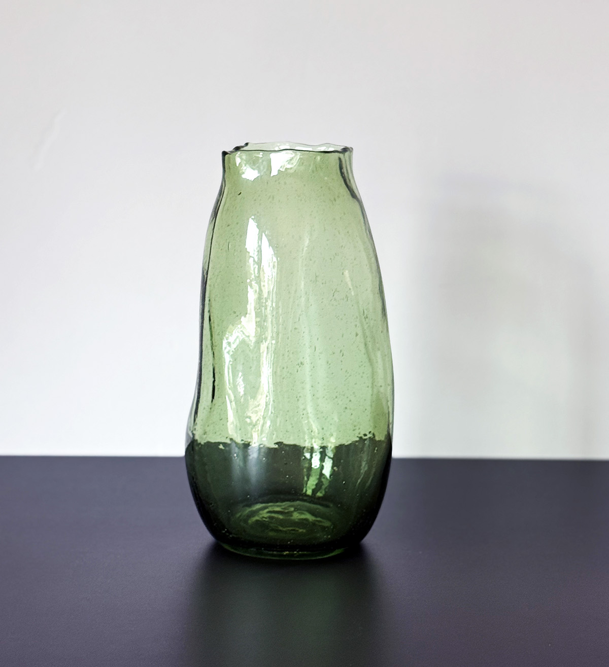 This glass organic shaped vase in marbled green is a unique and stylish addition to any space. Made of durable glass, it features a smooth, curved surface with a natural and elegant appearance.